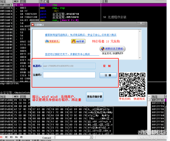 红色箭头指的位置是CMP EAX,0,这句代码的意思就是比较EAX和零是否相等?比较的结果会影响下一行JNZ这个条件跳转是跳还是不跳?绿色箭头指的位置是TEST EBX,EBX,这句代码的意思是判断EBX的值是否为零?结果会影响下一行JZ这个条件跳转是跳还是不跳?第三类指令是运算指令,比如ADD就是两个数值相加,DEC就是两个数值相减,还有乘法、除法等等,了解运算指令的用处是能够分析出程序编写者的真码是怎么运算得来的,换句话说就是能够弄清楚这个软件进行验证的“算法”。你可能会问,真码不是作者在编程的时候就写好的吗?比如真码为5211314。呵呵,现在的软件很少用一个固定的真码了,你想想看,如果这个程序有一个固定的真码,那么有一个人知道了,那么所有人不都可以无偿使用了吗?因此,为了更好的保护软件,编写者在编写软件的时候是不会有固定的不变的真码的,最普通的方式是根据不同的登录账号,程序里面有一个算法的子程序,或者叫做算法CALL,作用就是负责根据登录账号计算出真码,所以真码不是作者写在程序里的,而是在程序执行时根据账号算出来的,所谓验证就是假码和计算出的真码进行比较。现在你的脑子里应该有这样的一个程序执行的流程,先调用一个算法CALL,根据登录账号计算出真码;然后调用一个验证CALL,对真假码进行比较;根据比较的结果通过条件跳转指令跳转到不同的代码(成功或者失败的结果)。现在清楚了吧,我们破解,也叫做逆向,所谓逆向就是从结果往前分析,找到关键跳转,然后你改一下流程,这就叫做“爆破”。如果继续往前找到验证CALL和算法CALL,就叫做“追码”和“追算法”。