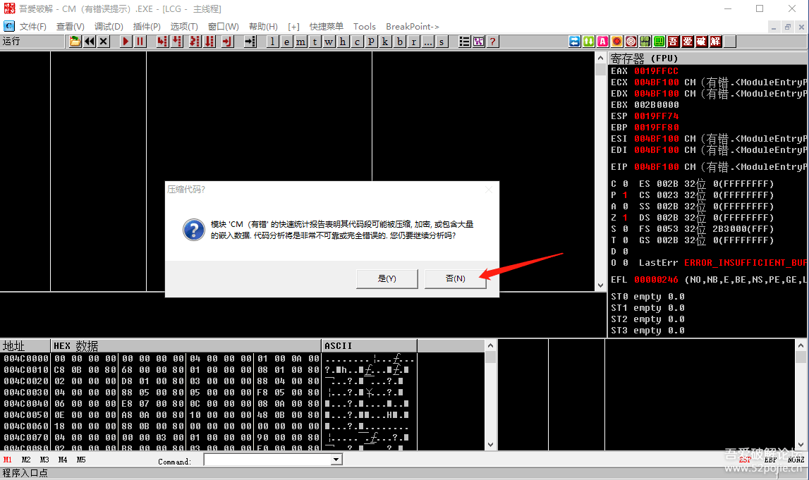 当有壳的程序拖到OD里,就会出现这样的提示。我们点红色箭头指的“否”。为什么?因为OD都说了,它分析的不可靠,那你还让它分析干什么,所以点“否”,不影响我们正常使用OD的功能。然后,请注意,这个时候,你直接进行“智能搜索”是搜不到关键字符串的。