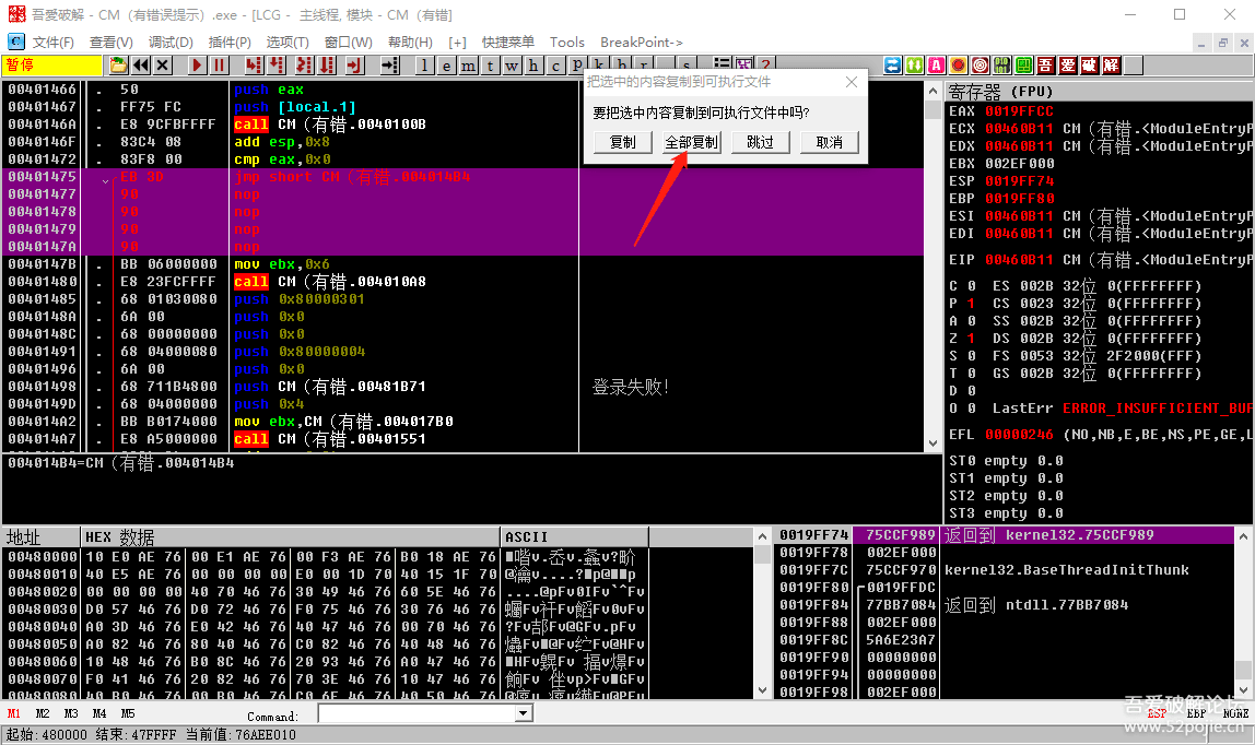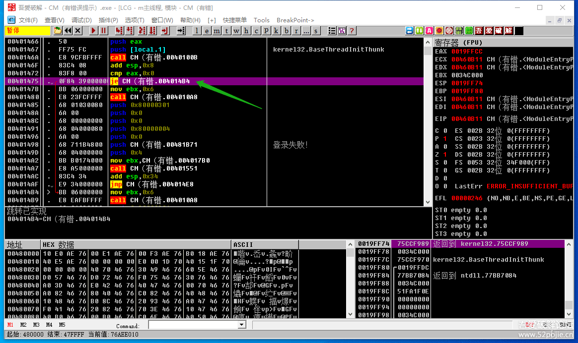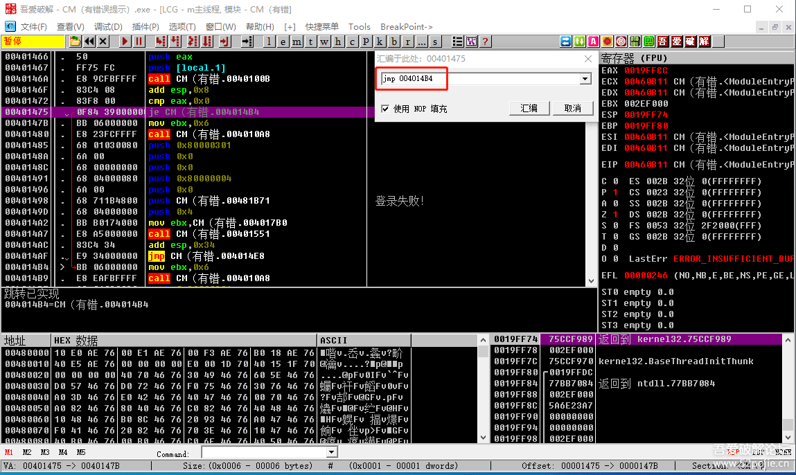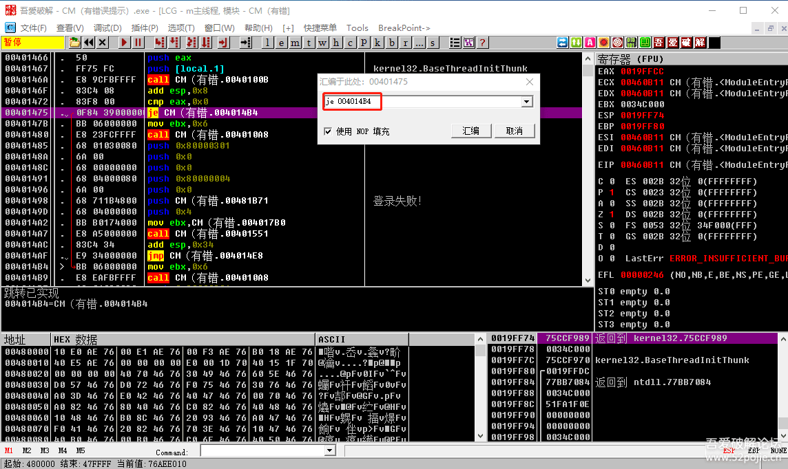 看到了吗?上面有一个JE跳转可以跳过“登录失败”这行代码。我们现在在JE这行代码上鼠标双击,就会出现下图: