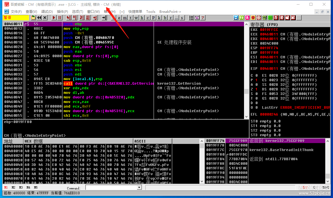 看一下红色箭头指的是CM,而且代码区是地址是小地址,所以证明我们的程序此刻停在“程序空间”,怎么判断程序是暂停状态呢?你看一下代码区的左上角是不是有一个红色的“暂停”,如果是运行状态,就会写“运行”。