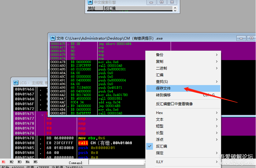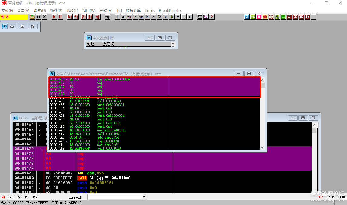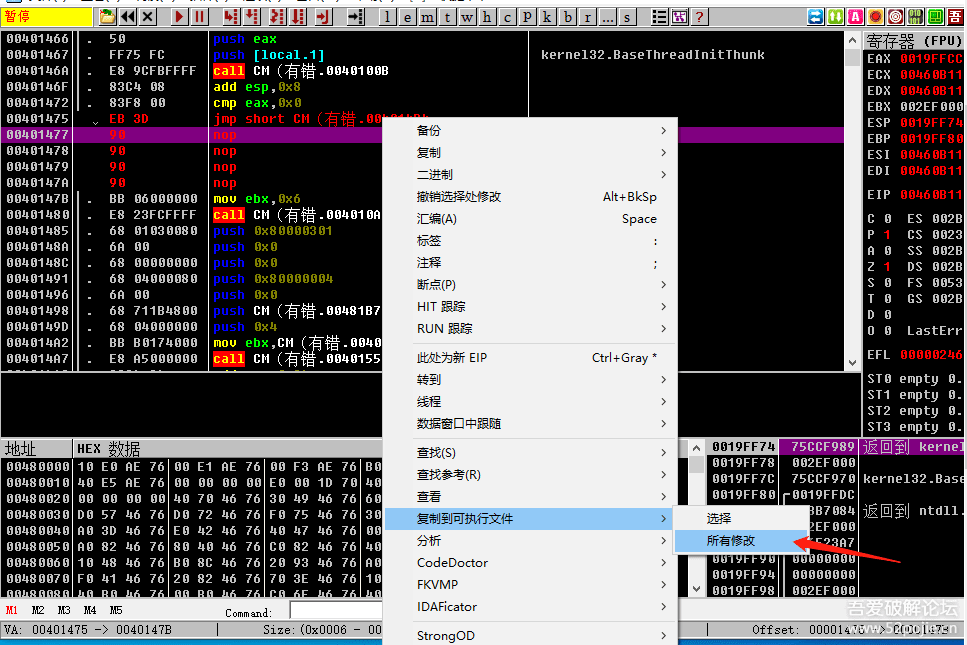 好,然后我们就把脱壳后的CM拖到OD里面进行分析。