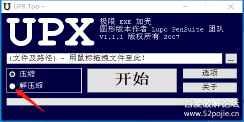 怎么使用呢?你把要脱壳的CM软件拖到这个界面上,然后在红色箭头指的“解压缩”前的白色圆圈内点一下,然后点开始。你的电脑桌面上会出现下图:
