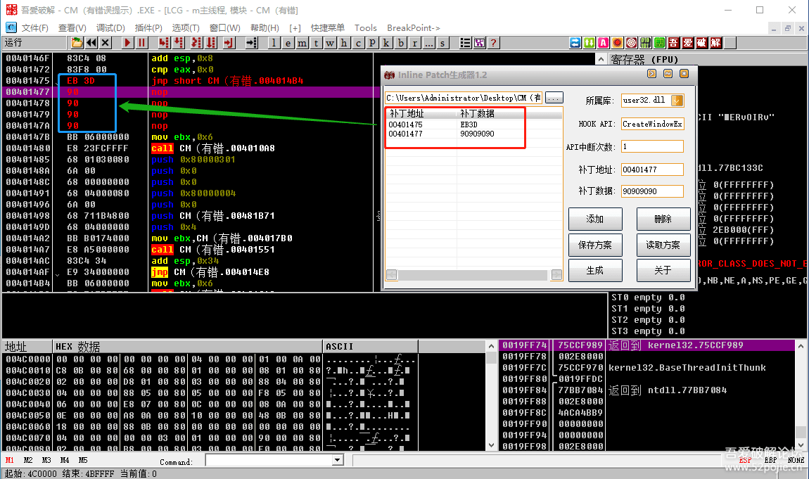 下面白色的是原来有壳文件的备份,上面的是脱壳后的CM,你可以再用PEID查一下,此时是不是已经没有壳吗?