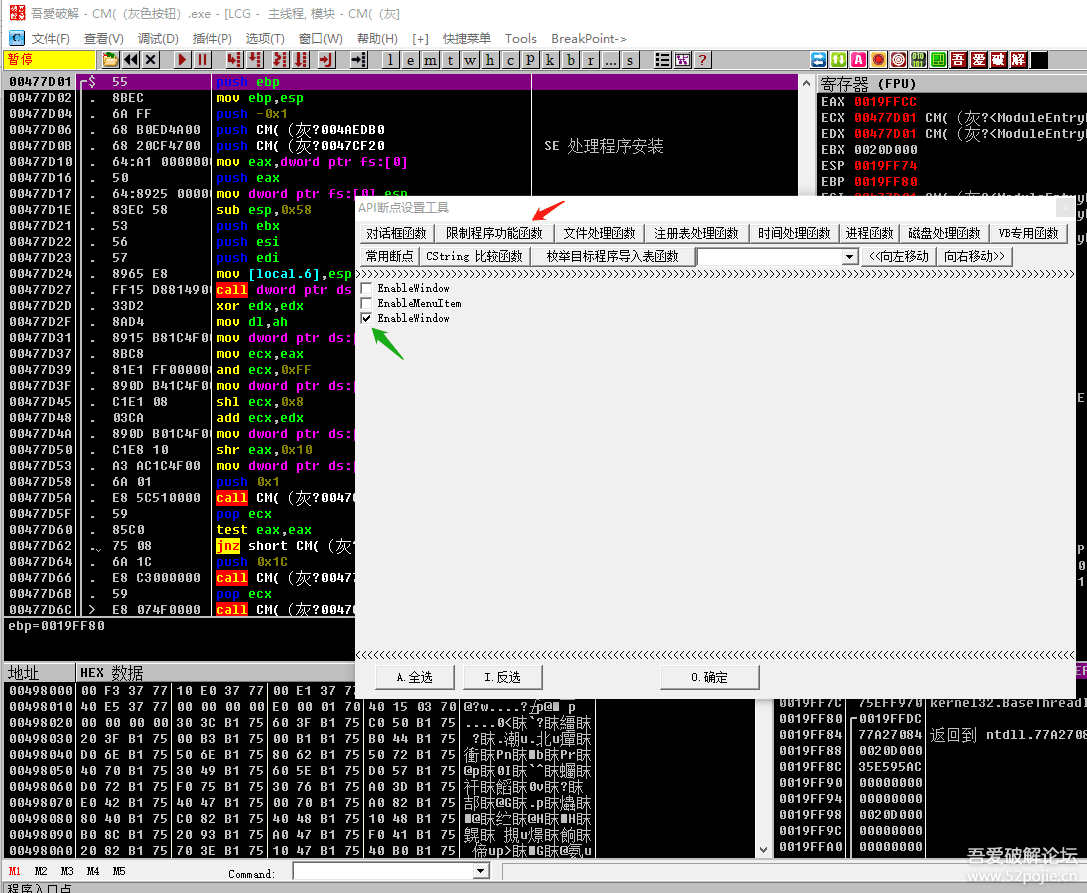 选择红色箭头指的“限制程序功能函数”,在绿色箭头指的最下面的“EnableWindow”前打钩,然后按确定,就下好了断点。