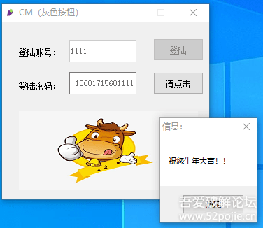 流程为:软件启动后,窗口中的“请点击”按钮处于“灰色状态” → 用户输入账号和密码,点击登陆按钮 → 读取用户输入登陆账号和假码 → 调用算法CALL,计算出真码 → 调用验证CALL对真假码进行比较 → 比较结果为真,“请点击”按钮的状态变为可点击,点击后出现“小牛”图片和弹出“祝你牛年大吉”的信息框;比较结果为假,没有变化。