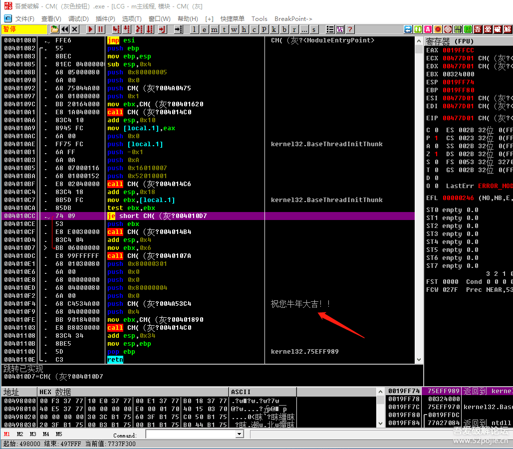 我们可以搜“祝你牛年大吉”这个字符串,也可以下弹出信息框的MessageBoxA函数断点。会来到下图: