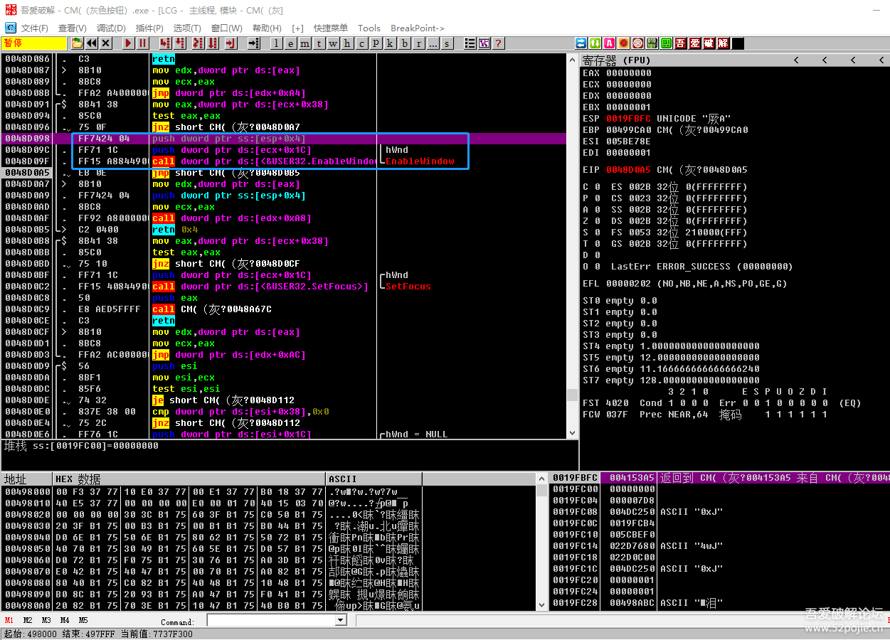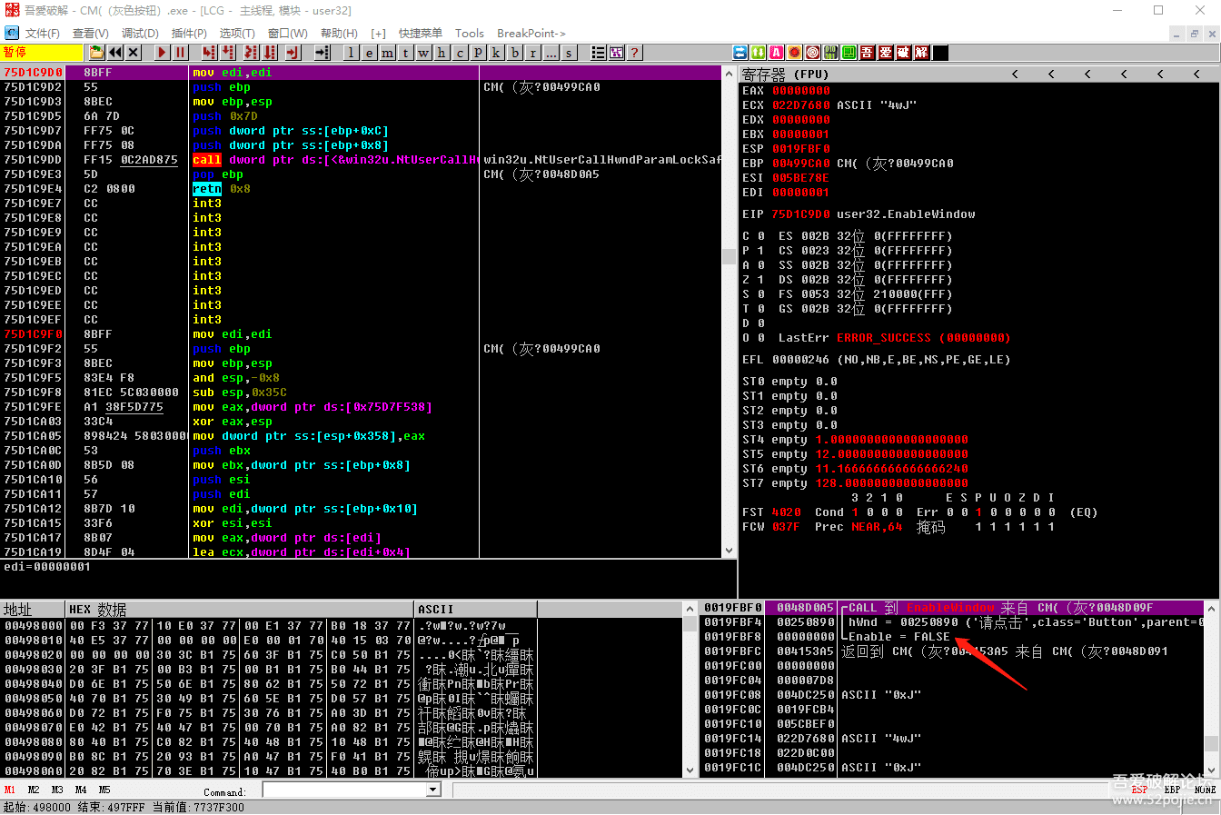 蓝色方框内就是调用EnableWindow函数的位置,这个函数有两个参数,就是CALL上面的两个PUSH后面的数值。