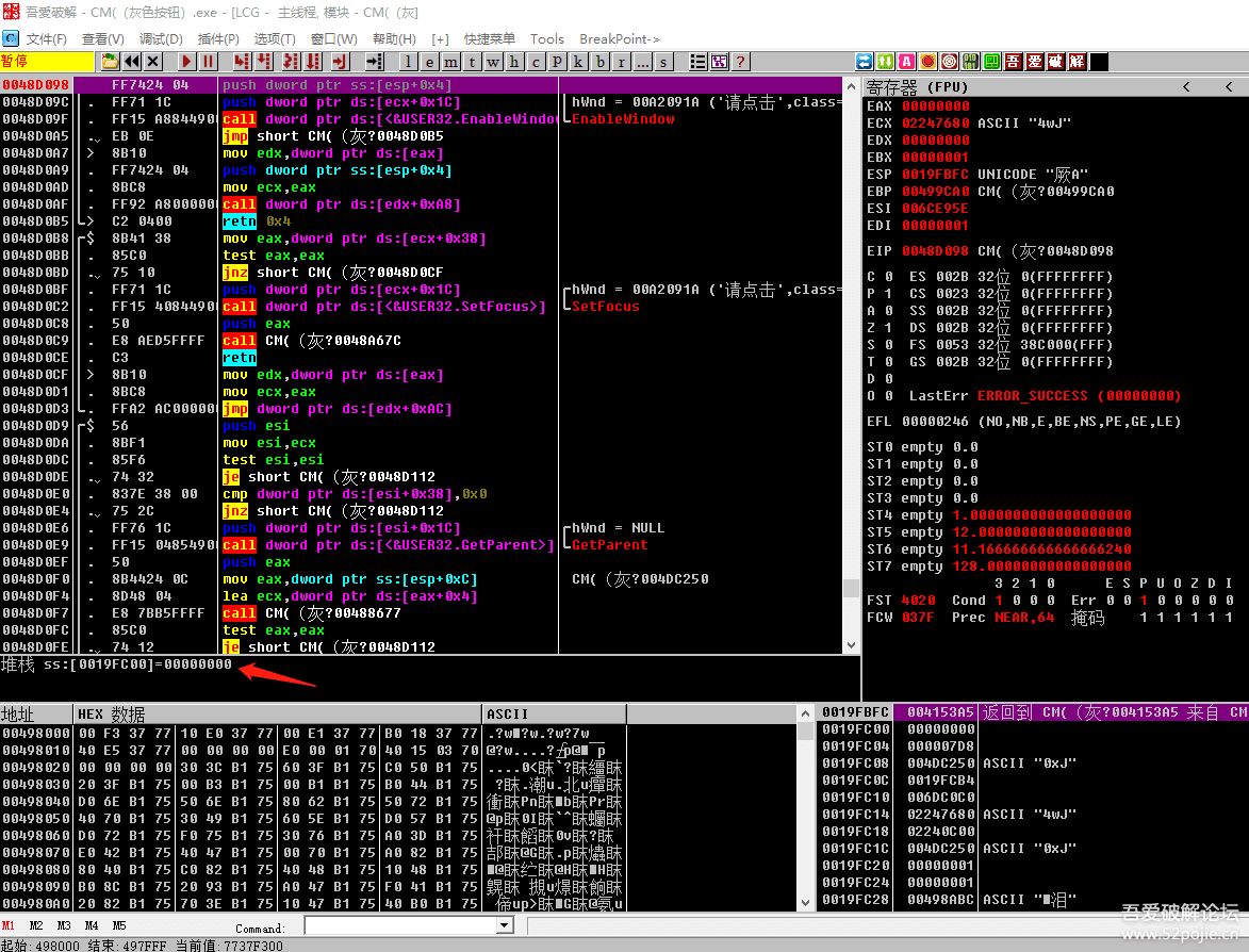 我们在信息窗口中红色箭头指的地方看到了0,就是说我们目前断下的PUSH语句后面的数值是0。